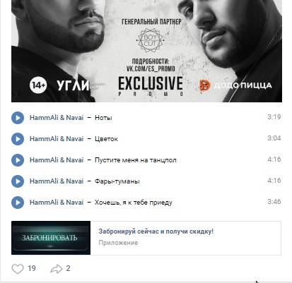 — Подписчики групп: HAMMALI & NAVAI, MiyaGi & Эндшпиль, Тимати, Крид, Каспийский груз, Jah Khalib, T-Fest , Баста, L'One, Мот, Джиган, Artik & Asti, Элджей, Иван Дорн, Feduk, Скриптонит,Oxxxymiron, Олег Mаями, T-Killah, «Дневник Хача», Гуф, Монеточка, Луна, Матаранг, Новый реп, Еа-7, Кавказские группы, Loc-Dog, Faraoh, Дима Билан, ЛСП, Black Star, Бузова, Лобода, Честный, Зомб, Плейлист души, Markul.