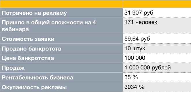 — По итогу вебинаров было продано 10 банкротств стоимостью 100.000 ₽ каждое